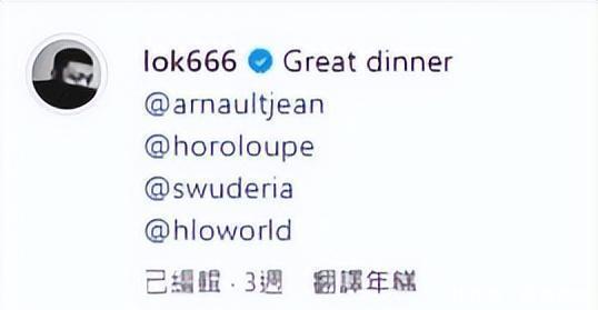 余文乐近最近贴出两次饭叙的相片,相片中接近全男班,他更标注部分同场东说念主士并写说念:“Great dinner、Bros for life, Love you all. (丰汜博餐、终生昆仲,爱你们)”相片中所见,与余文乐约聚的男士们来头不少,当中有世界首富LVMH雇主Bernard Arnault最小的女儿Jean Arnault,以及被余文乐搭肩膀的是二手手表往复平台Wristcheck辩论首创东说念主之一Sean Wong。