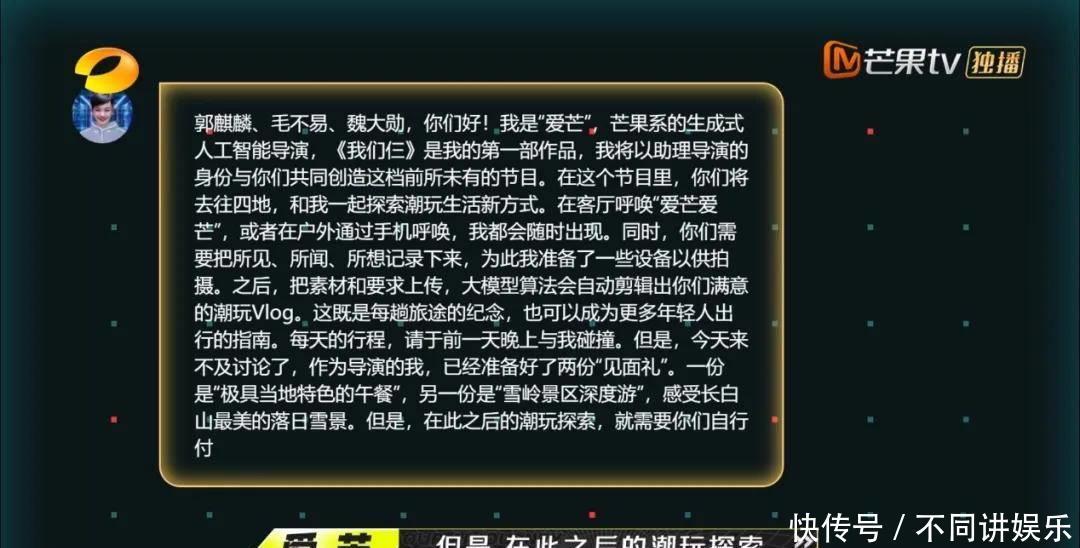 最近芒果TV播出的熟东说念主旅综《咱们仨》也可以看到游戏元素与模式集结的场所,这档节目打出了首位AI导演操盘的旌旗,试验上AI导演在节目中更像是小爱同学似的存在,认真帮嘉宾们看守试验出现的问题、经营道路等等。
