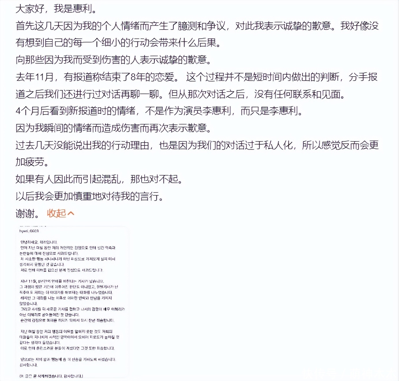 李惠利先是抒发古道歉意,示意这几天因为她的个情面绪,导致了好多揣摸和争议,之后再次明确了和柳俊烈的分袂时辰,如实是2023年11月,接下来她反复因为我方发文激发全网公论而谈歉,临了更是强调会愈加介意对待言行。