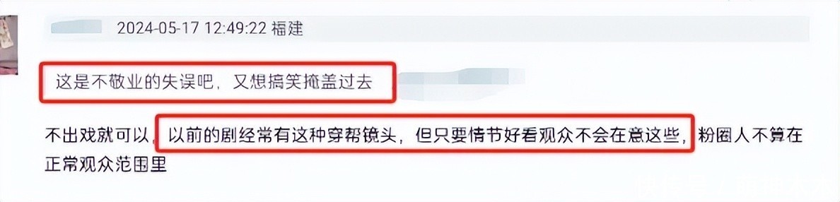 有网友看到穿帮镜头吐槽演员不敬业,但大大批如故不详体谅陈谈明,合计不应该审判老东谈主家。还有网友合计第二季拍摄太支吾,责骂穿帮镜头真的太多。可能是《庆余年》受众平方,大部分网友对其很宽宏,示意古装剧有穿帮镜头很正常,只消不影响剧情发展不消太防备,并合计穿帮镜头的职守主要在后期审片。