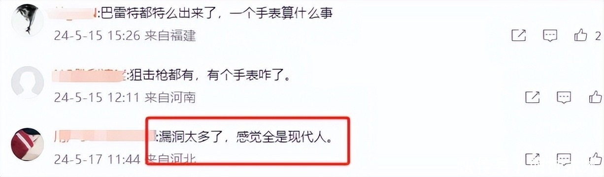对于腕表问题,有网友合计这是剧情埋下的伏笔,因为他亦然当代东谈主。关联词,东谈主物先容中并莫得说起这少量,只可说玩梗能消解一些剧方的空幻。